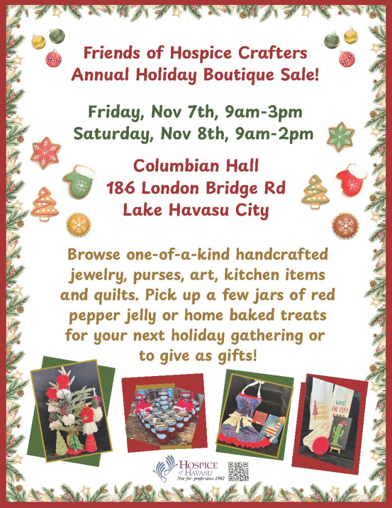 Proceeds from the annual holiday boutique support the patients and programs of Hospice of Havasu. Trusted by the community since 1982, Hospice of Havasu is a nonprofit organization dedicated to providing compassionate care with dignity to individuals and families facing serious illness in Lake Havasu City and Bullhead City. Need Help? Call 928-453-2111 or visit