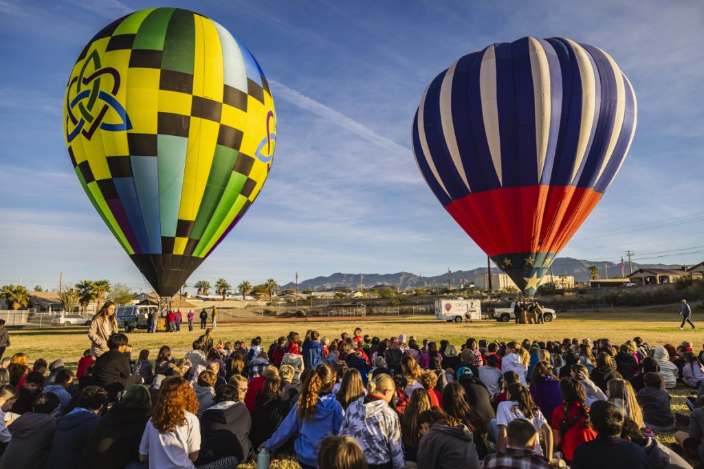 Students get to see hot air balloons up close at Oro Grande Elementary School Thursday. Tyanna Renee’/RiverScene