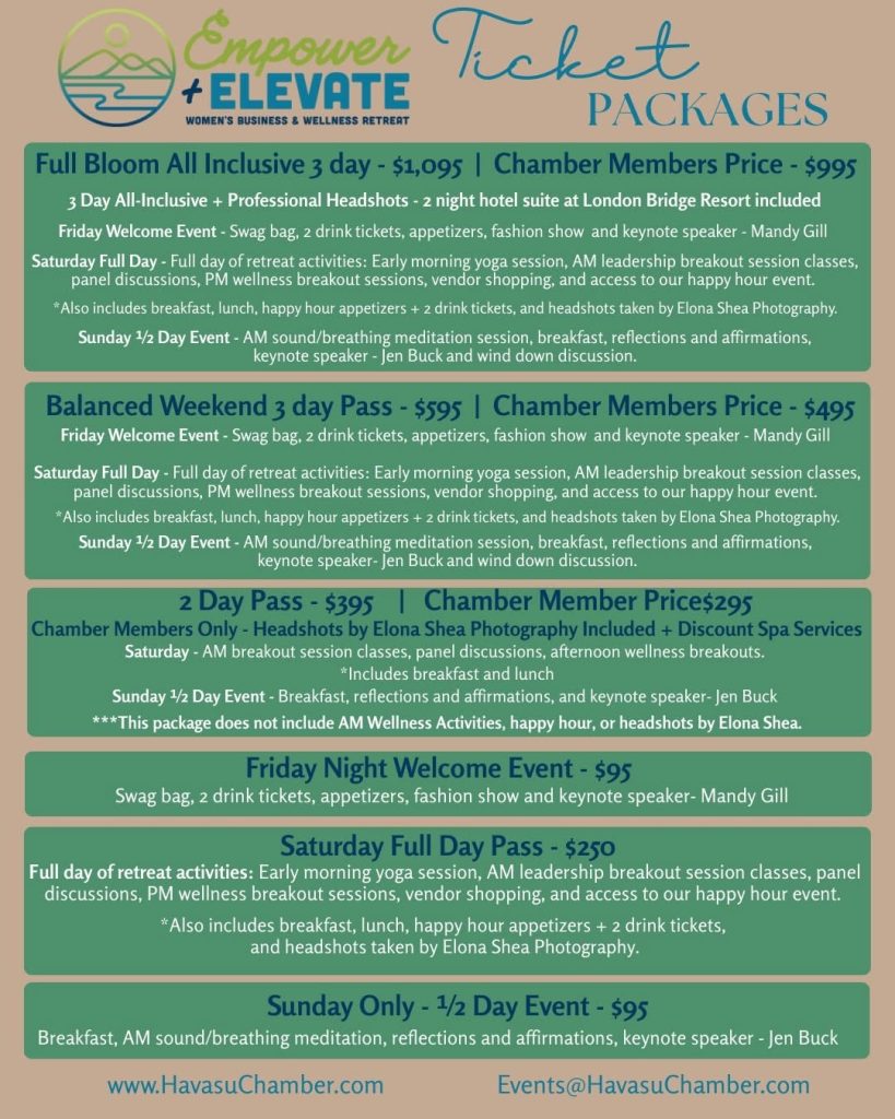 For more information, to purchase tickets, or to view a complete retreat schedule, visit www.havasuchamber.com. You can also email Amanda Mehaffey at events@havasuchamber.com