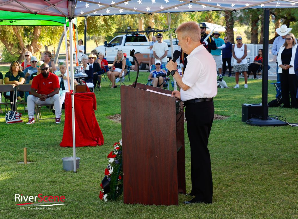 Sisto Sandoval opened the ceremony with a prayer over our nation and our community. Following the prayer, the Lake Havasu Marine Corps League, LHFD, and LHPD presented the colors, following the flag raising of the American flag by Rosamond Naylor and the POW/MIA flag by Kenny Gleason.