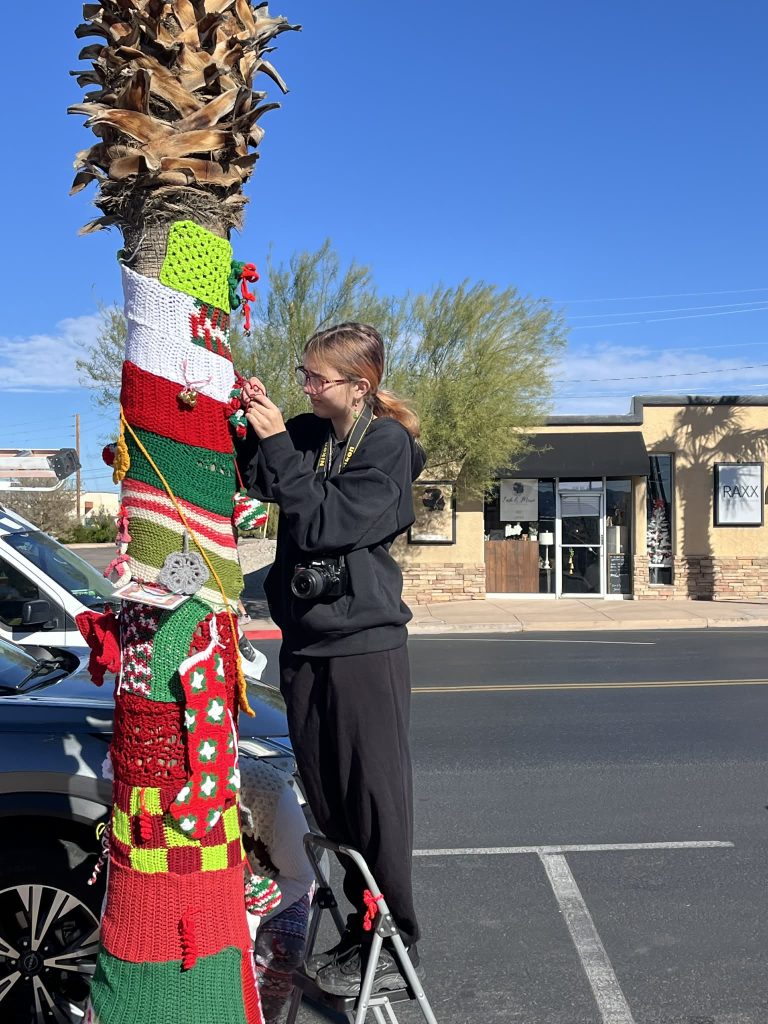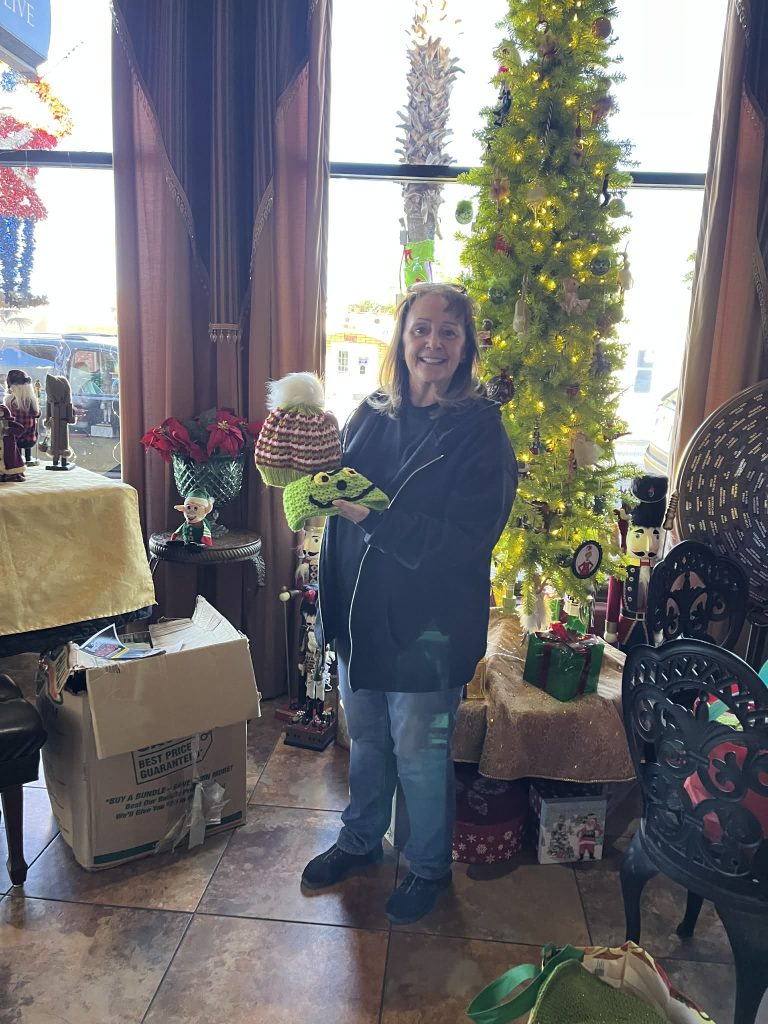 “This year, we did a Grinch tree since Grace Arts show is the Grinch. We also donated four large bags of handmade hats, scarfs and headbands in grinch colors for a fundraiser to help the kid’s theater,” Knotty Knitters member Linda Scoles said.